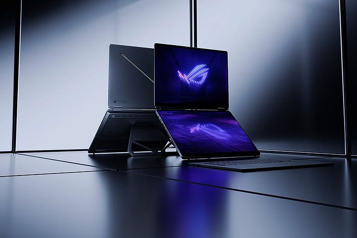 ASUS ROG Zephyrus Duo — первый на рынке ноутбук, имеющий два 16-дюймовых OLED-экрана. Они расположены друг над другом, поэтому компьютер напоминает раскладной смартфон. Но можно менять расположение и ориентацию дисплеев. Так, есть режим «Книга», в котором две половинки установлены вертикально — чтобы читать соцсети. В режиме «Палатка» нотбук принимает V-образную форму.