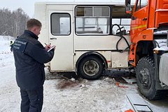 Рейсовый автобус совершал обгон. Выехав на полосу встречного движения, он лоб в лоб столкнулся с КамАЗом, а после этого отлетел на обочину, где был припаркован бензовоз.