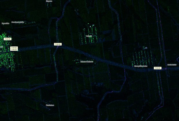 Спутниковый снимок территории к юго-востоку от Новониколаевки (подконтрольные Киеву территории Запорожской области). На снимках видны автомобильные дороги, а также вырытые ВСУ траншеи